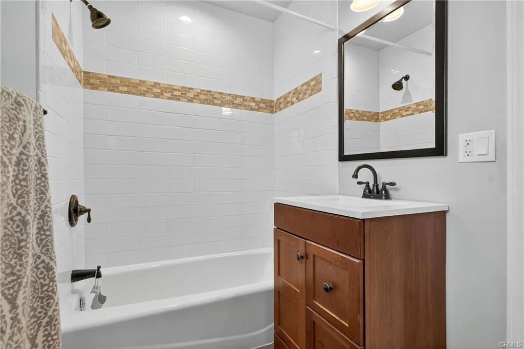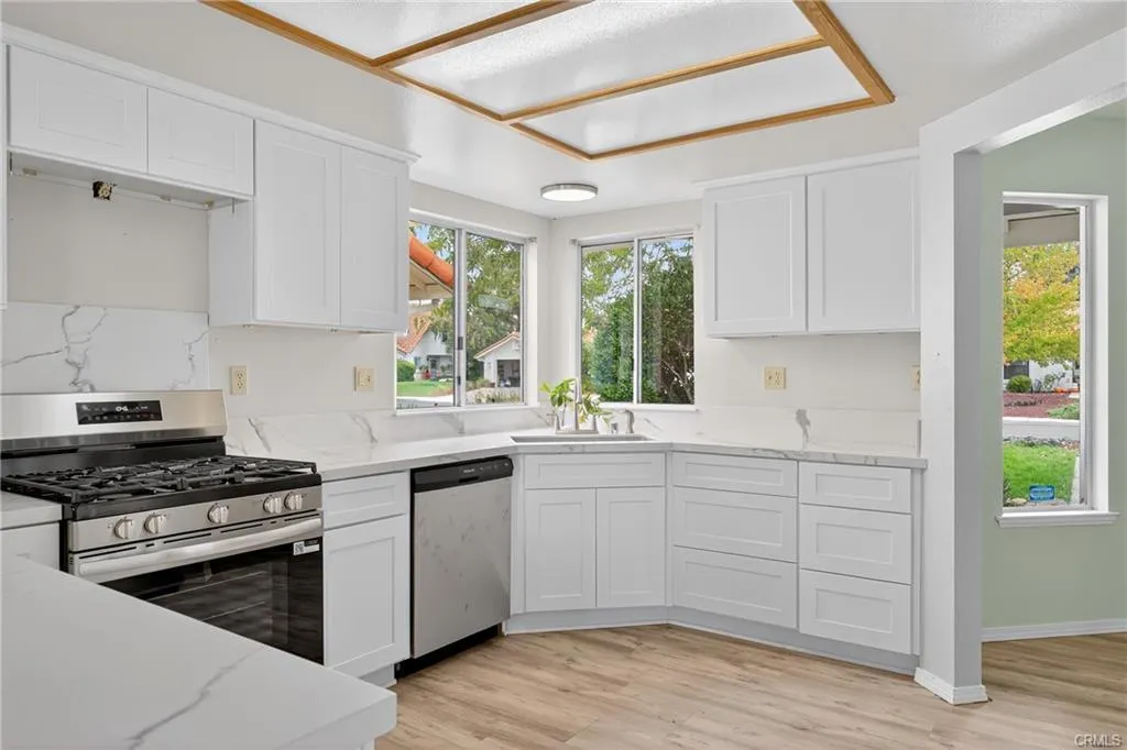 Modernized kitchen with white shaker cabinets and quartz countertops.