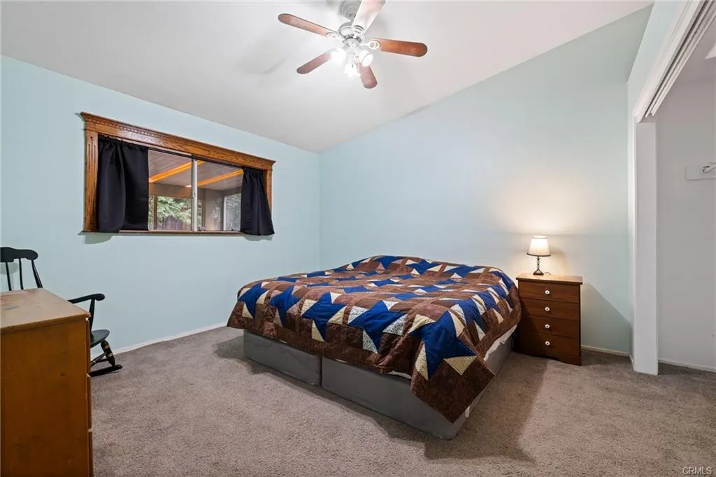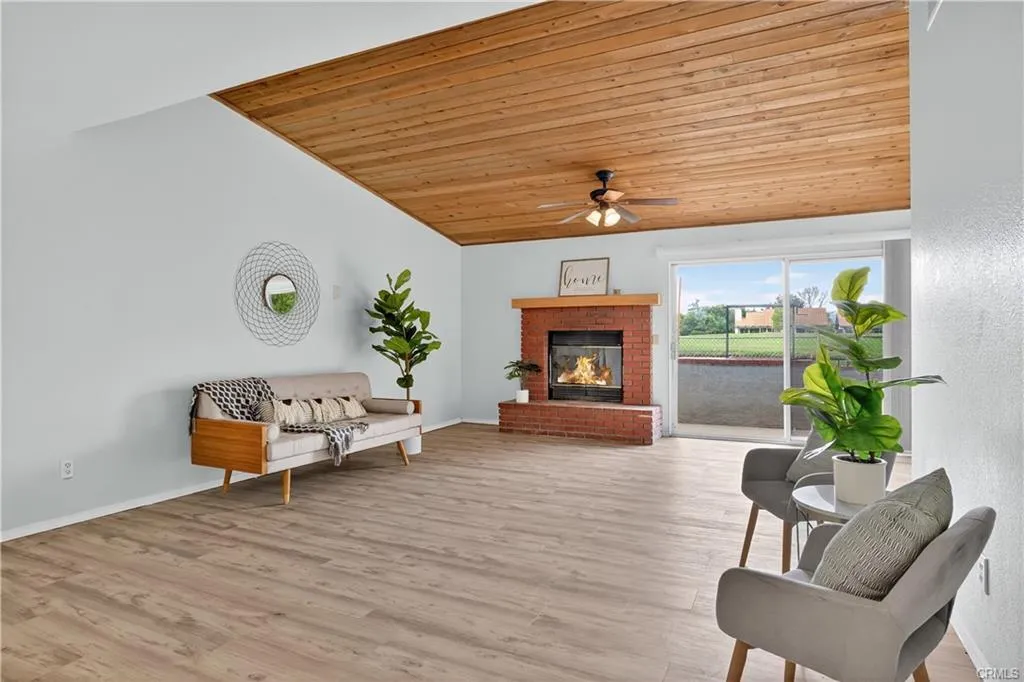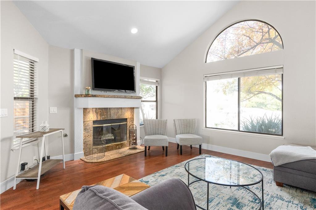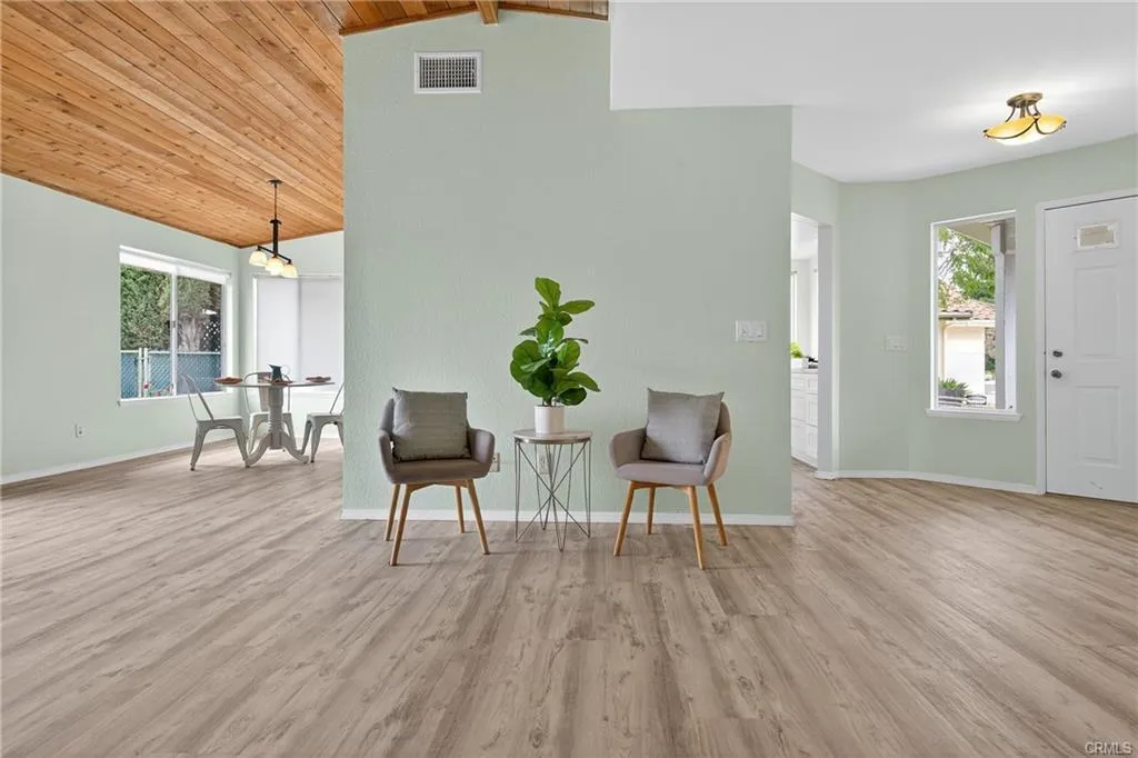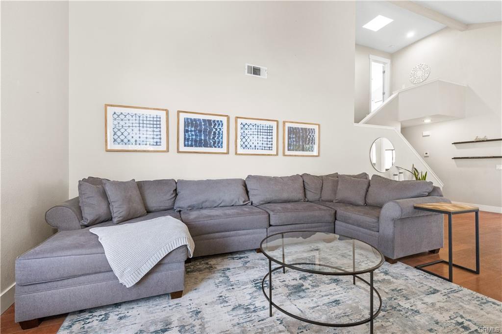 Bright and open living space with cathedral ceilings.